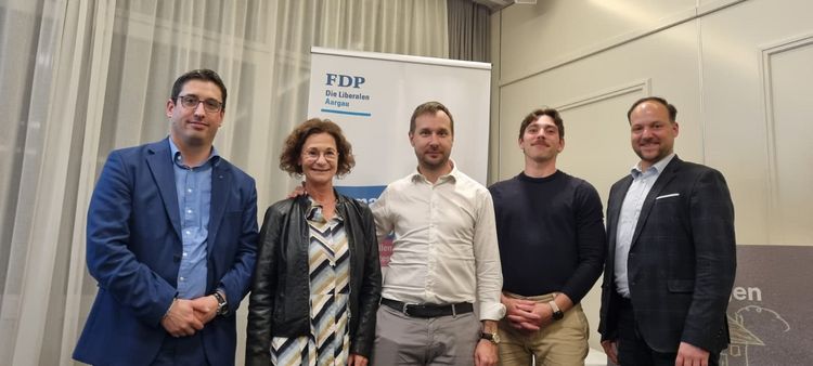 Stefan Huwyler (Geschäftsführer), Sabina Freiermuth (Präsidentin), Christian Steiner (Fraktionssekretär FDP Schweiz), Nicola Richli (Präsident FDP Bezirk Laufenburg), Norbert Stichert (Vizepräsident) (v.l.n.r.).